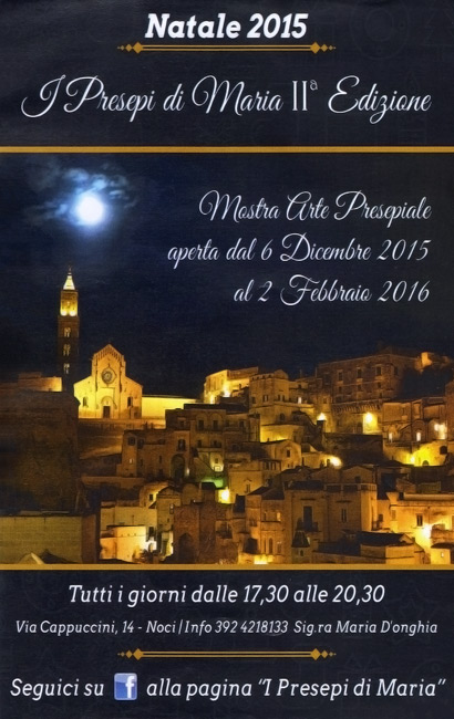 L’esposizione, presente anche all’interno del programma “Natale a Noci”, è aperta dal 6 dicembre 2015 al 2 febbraio 2016, dalle ore 17:30 alle ore 20:30 in via Cappuccini 14.