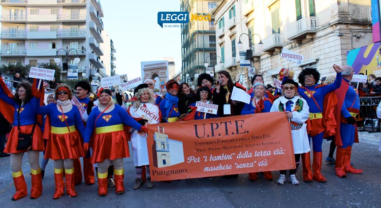 Sul corso i sette carri allegorici, alcuni dei quali superano i 16mt d’altezza, dedicati agli eroi del nostro tempo. I mastri cartapestai Deni Bianco, Franco Giotta, Marino Guarnieri, Domenico Impedovo, Angelo Loperfido, Vito e Paolo Mastrangelo, Lello Nardelli ancora una volta si sono messi in gioco dando lustro della scuola putignanese. La danza dei gruppi mascherati e l’intervento di tante associazioni del territorio a fare da cornice ad un’atmosfera di festa e giocosità.