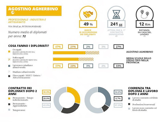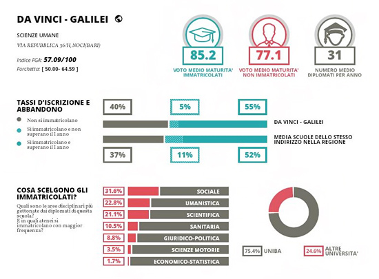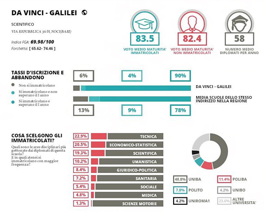 L’indirizzo del Liceo delle Scienze Umane si colloca al primo posto fra le scuole di pari livello nel raggio di 30km da Noci con un punteggio di 57,09 (Indice FGA). È un indice che mette insieme la Media dei Voti e i Crediti Ottenuti normalizzati in una scala che va da 0 a 100, dando un peso pari al 50% ad ognuno dei due indicatori). L’indirizzo del Liceo Scientifico si colloca al sesto posto fra le scuole di pari livello nel raggio di 30km da Noci con un punteggio di 69,98 (Indice FGA). L’indirizzo del Professionale – Industria e Artigianato si colloca al secondo posto fra le scuole di pari livello nel raggio di 30km da Putignano con un punteggio di 49,03 per la coerenza tra studi fatti e lavoro trovato e sempre al secondo posto con un punteggio di 33,98 per l’indice di occupazione dei diplomati. L’indirizzo del Professionale – Servizi si colloca al quinto posto fra le scuole di pari livello nel raggio di 30km da Putignano con un punteggio di 36,52 per la coerenza tra studi fatti e lavoro trovato e al settimo posto con un punteggio di 55 per l’indice di occupazione dei diplomati.