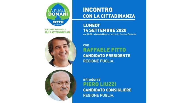 NOCI - Questa sera, alle ore 18.30, nei pressi del Comitato Elettorale del Candidato Consigliere Piero Liuzzi, sarà presente a Noci Raffaele Fitto, Candidato Presidente Regione Puglia alle elezioni regionali del 20/21 settembre.