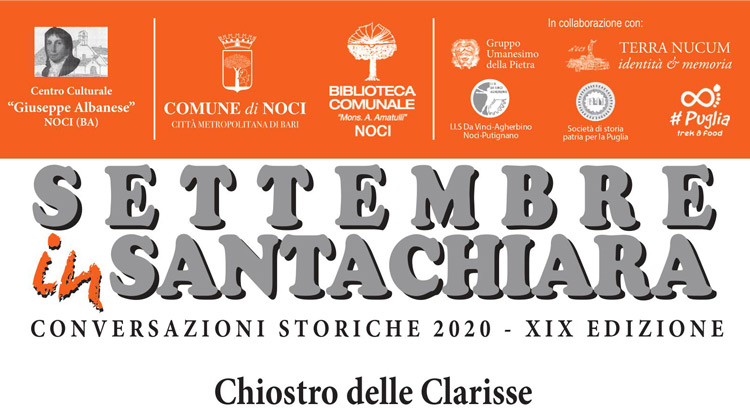 NOCI - Ritorna l’atteso appuntamento annuale con “Settembre in Santa Chiara”, organizzato dal Centro culturale “Giuseppe Albanese”, dal Comune di Noci e dalla Biblioteca comunale “Mons. Amatulli”. L’ ormai tradizionale ciclo di conversazioni storiche è  nato nel 2002 con lo scopo precipuo di affrontare argomenti legati alla storia della comunità nocese con originali e inediti […]