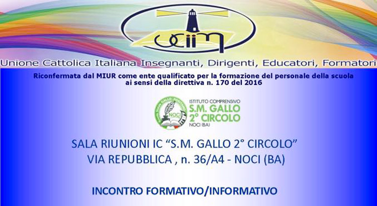 Scuola "Gallo" via Repubblica, Noci, ItaliaNOCI - La sezione UCIIM (Unione Cattolica Italiana Insegnanti, dirigenti, educatori, formatori) di Noci/Putignano, organizza per domani, giovedì 16 novembre, presso la sala riunioni della scuola “Gallo” un incontro di Informazione/Formazione, rivolto a Docenti, Dirigenti Scolastici, Aspiranti all'Insegnamento dal titolo: “L’offerta formativa UCIIM sul territorio per il territorio”. Interverranno la prof.ssa Vanna D’Onghia, presidente della […]