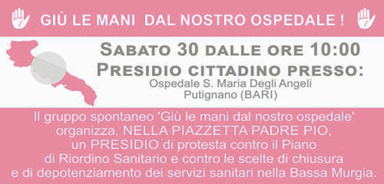 Piazzetta Padre Pio piazza Padre Pio, Putignano, ItaliaPUTIGNANO - Il gruppo spontaneo 'Giù le mani dal nostro ospedale' organizzaa partire dalle ore 10 di SABATO 30 p.v. NELLA PIAZZETTA PADRE PIO un PRESIDIO di protesta contro il Piano di Riordino Sanitario e contro le scelte di chiusura e di depotenziamento dei servizi sanitari nella Bassa Murgia. Si CHIEDE la MASSICCIA COLLABORAZIONE di […]