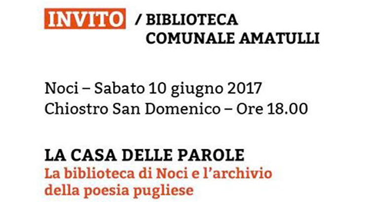 Chiostro San Domenico via Repubblica, Noci, ItaliaNOCI - Questo pomeriggio, sabato 10 giugno, dalle ore 18.00 alle 19.00, nell’ambito del “Piccolo Festival della Parola” in corso di svolgimento a Noci, presso il Chiostro di San Domenico si terrà l’incontro “La casa delle parole: la biblioteca di Noci e l’Archivio della poesia pugliese". Parteciperanno: Anna Vita Perrone – Direzione di Teca del […]