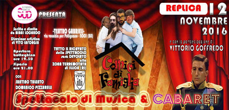 Teatro Gabrieli Noci, ItaliaNOCI - Nuovo appuntamento con la comicità targata Il Talento Nasce al Sud. La premiata ditta di comici nostrani sabato 12 novembre replicherà al teatro “Gabrieli” lo spettacolo Comici di Famiglia il cui incasso sarà completamente devoluto alla frazione di Illica rasa al suolo dal terremoto del 24 agosto scorso. Sul palco oltre a Ninni […]