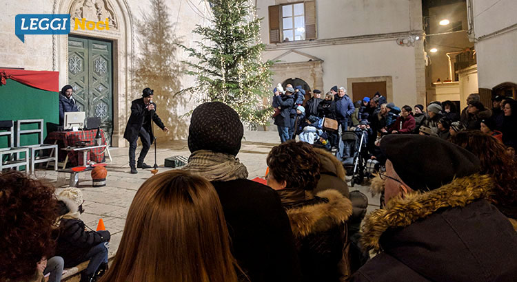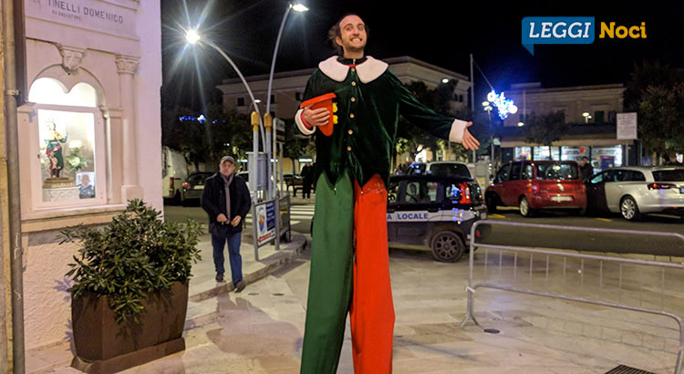 Il percorso ha avuto inizio da via Porta Putignano, dove all’ingresso del borgo antico un simpatico elfo-clown sui trampoli ha accolto i visitatori dando loro il benvenuto. Successivamente, l’itinerario è proseguito in Largo Diaz, dove il giovane attore nocese Nicola Boccardi, accompagnato da un sottofondo musicale eseguito dal chitarrista Pierfrancesco Troviso, ha letto alcuni racconti natalizi per grandi e piccini.