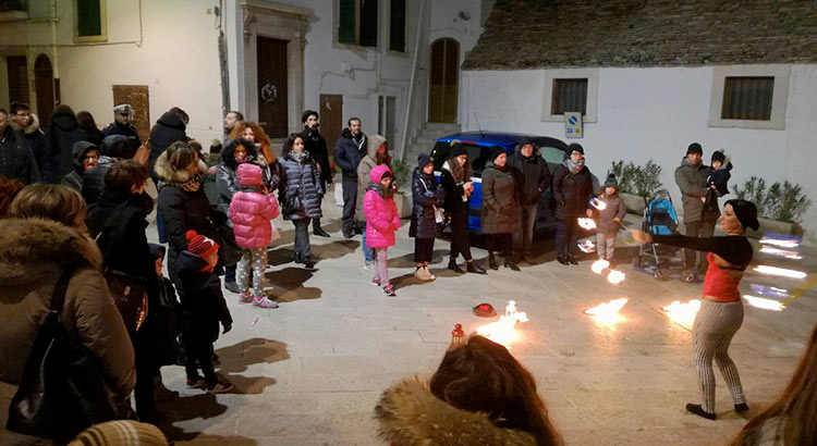 Terza tappa del percorso è stata Largo Santa Chiara, dove i passanti hanno assistito ad uno spettacolo di una giovane artista leccese dal titolo “Silvia Fire Show”, che si è esibita in acrobazie con il fuoco. Infine, l’itinerario si è concluso in piazza Plebiscito, dove ad attendere i visitatori vi era il simpatico spettacolo del duo Skizzo & Carletta, con clown alle prese con magie, giocoleria ed equilibrismo, e Simone Tuosto, in arte Mone Mone’, che sul sagrato della chiesa matrice ha dato vita allo spettacolo Retro’, un mix di cabaret, magia, giocoleria, equilibrismo su oggetti, verticalismo su sedie, e tanto altro.