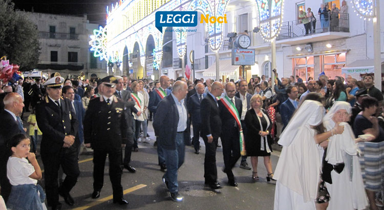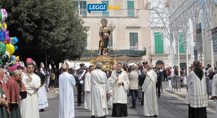 Anche il clero tiene in seria considerazione la festa patronale di Noci. A dimostrarlo le sante messe con conseguenti processioni celebrate dai vescovi Giuseppe Favale e Giovanni Intini. Dal comitato feste patronali presieduto dall’arciprete don Stefano Mazzarisi sono pervenute diverse novità per l’organizzazione della festa ad iniziare dalla reliquia del santo giunta direttamente da Frigento (Av) il 24 agosto scorso ed ammirabile sino al 23 settembre prossimo. In tema di processioni non è passata inosservata la presenza dell’ex senatrice Angela D’Onghia, in prima fila durante la processione di gala insieme alle autorità civili pur non rappresentando più alcuna istituzione. Invece a conclusione della processione di ieri sera i palloncini liberati in aria in onore del santo si sono bloccati nell’intreccio di fili intessuto per sostenere le luminarie di piazza Garibaldi.
