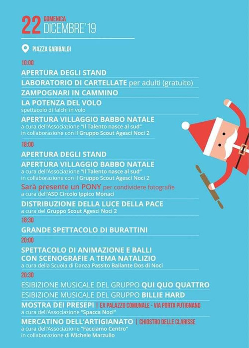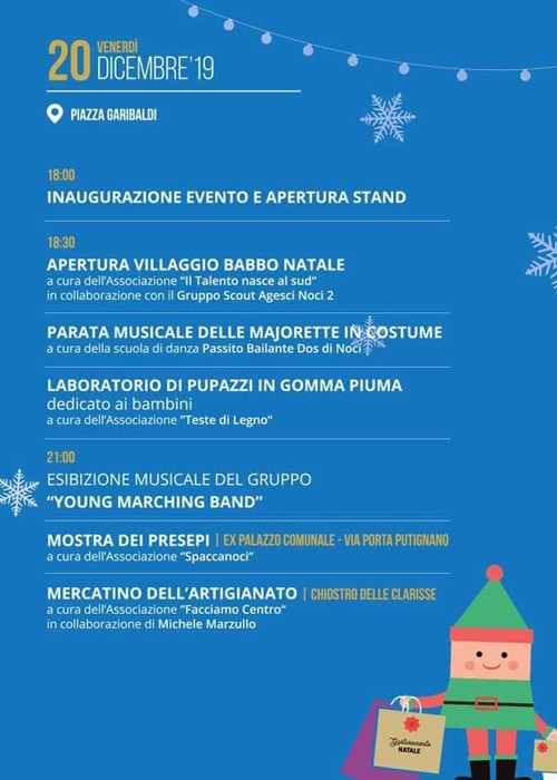 Ore 18,30 – Apertura Villaggio Babbo Natale a cura dell’Associazione “Il Talento nasce al sud” in collaborazione con il gruppo Scout Agesci Noci 2 ;