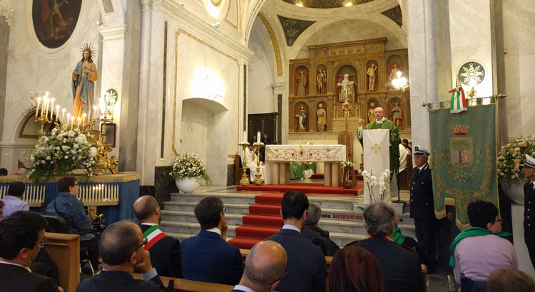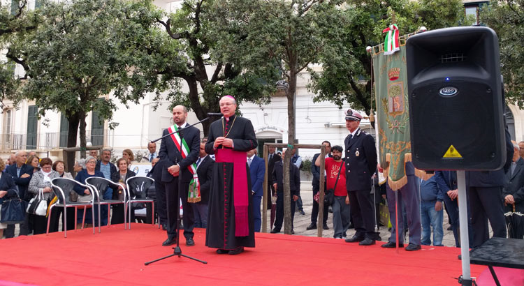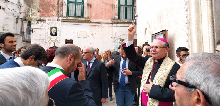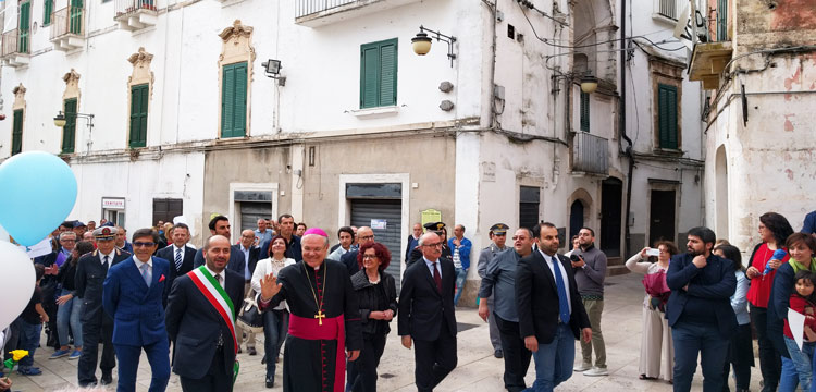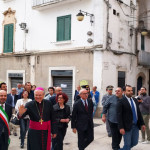 A seguire, ha avuto luogo un corteo introdotto dagli scout e dal complesso bandistico “S. Cecilia-Sgobba”, giunto alla chiesa matrice per assistere alla celebrazione della santa messa, al termine della quale sono intervenuti il senatore Piero Liuzzi, che ha affermato: «ritengo che la chiesa, le istruzioni e la politica possano concorre al raggiungimento del bene comune» e la senatrice Angela D’Onghia, la quale si è espressa dicendo: «abbiamo paure e mali nuovi di cui non conosciamo l’esito, per cui abbiamo bisogno di guide verso l’umiltà e l’etica».