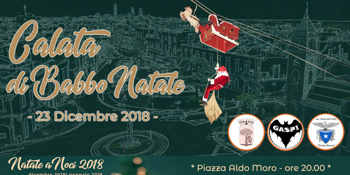 – Domenica 23 Dicembre, alle 19:00, assisteremo alla prima edizione della “Calata di Babbo Natale” a Noci. Tutti con il naso all’insù per una manifestazione voluta dall’Amministrazione Comunale e che vede impegnato il gruppo archeologico e speleologico Pugliese (GASP!) della sezione CAI di Gioia del Colle. Una spettacolare quanto suggestiva teleferica partirà dal campanile della Chiesa dei Cappuccini fino alla discesa del vecchietto barbuto che avverrà ai Giardini di Piazza Moro, per una lunghezza 120 mt. Babbo Natale, con slitta e renne, lascerà tutti i bambini a bocca aperta: prima di scendere lascerà cadere dal suo sacco qualche caramella, il tutto da una altezza di 15 metri circa. A seguire, dalle 21:00, si balla al ritmo travolgente di swing in Piazza Plebiscito con gli Swing & Soda in concerto, concerto offerto dall’Amministrazione Comunale.