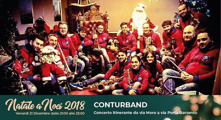 – Il 21 Dicembre, la Conturband per le vie del centro. Molti conoscono già questa coinvolgente street band costituita da 15 elementi tra fiati e percussioni, tutta Made in Puglia, la prima del Sud Italia. Dalle 21:00 alle 23:00 animerà le vie del centro da via Moro a via Porta Barsento.