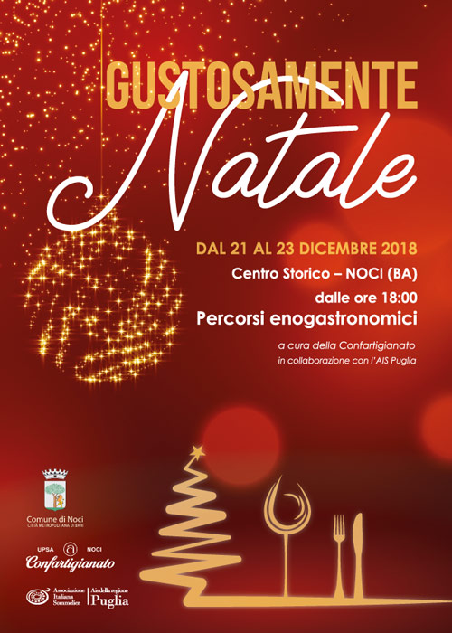 – Dal 21 al 23 Dicembre, dalle 18:00 a mezzanotte, affinate i palati con GUSTOSAMENTE NATALE. La Confartigianato Noci e l’Associazione Italiana Sommelier Puglia, in collaborazione con il Comune di Noci e con i ristoratori locali, tornano per un altro fine settimana a far rivivere il centro storico all’insegna, questa volta, della riscoperta delle migliori tradizioni eno-gastronomiche del nostro territorio.