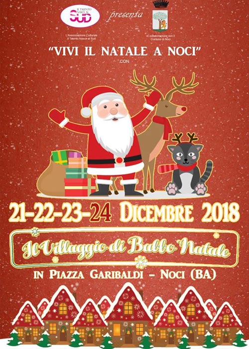 – Dal 21 al 24 Dicembre in Piazza Garibaldi, dalle 9:30 alle 12:30 e dalle 16:00 alle 21:00, Vivi il Natale a Noci con Santa Claus. I più piccoli saranno accolti nel fantastico mondo di Santa Claus con il villaggio di Babbo Natale, le sue renne, gli elfi, i laboratori per i bambini e la consegna delle letterine, animazione e spruzzi di neve artificiale, zucchero filato, pop corn, giostre gonfiabili con attrazioni musicali e luminose. A cura de Il talento nasce al Sud.