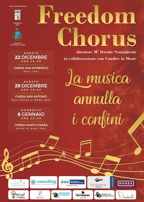 Alle 20:30 presso la Chiesa di San Domenico il Freedom Chorus si esibirà, nell’ormai immancabile Concerto di Natale “La musica annulla i confini”. Il coro nasce nel 2009, si compone di dieci coristi che condividono le stesse finalità: cantare per il piacere di cantare, per il piacere di emozionarsi ed emozionare chi ascolta. Sapientemente diretti dal maestro Davide Notarnicola propongono un ampio repertorio di brani gospel.