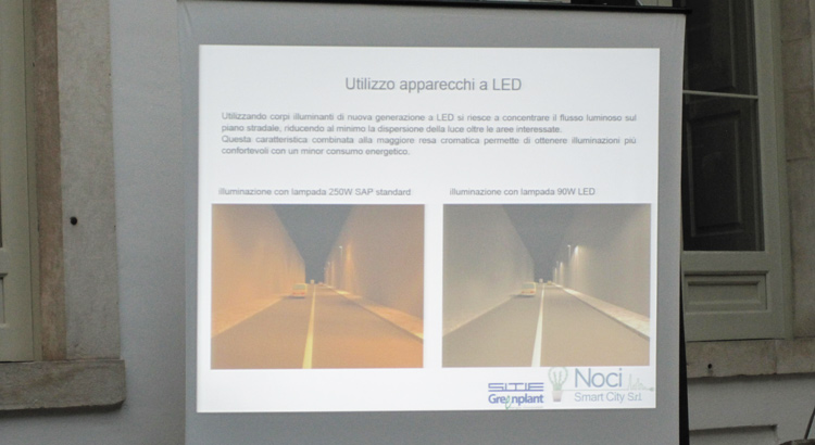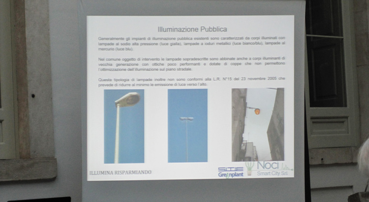Poi è toccato ai tecnici spiegare effettivamente di cosa si tratta. È l’ing. Adrea Pinotti della Sitie Greenplant srl, presentato come amministratore della società Noci Smart City srl (?) a dire di volere «un approccio di massima condivisione con la cittadinanza per un progetto che andrà avanti per anni». Il responsabile illuminotecnico ing. Andrea Govoni (delled srl) invece ha spiegato la differenza tra l’attuale illuminazione con lampade al rodio e la futura illuminazione con lampade al LED che oltre a meglio illuminare le strade per via di una luce direzionale, abbatterà l’inquinamento derivante dalla dispersione luminosa.