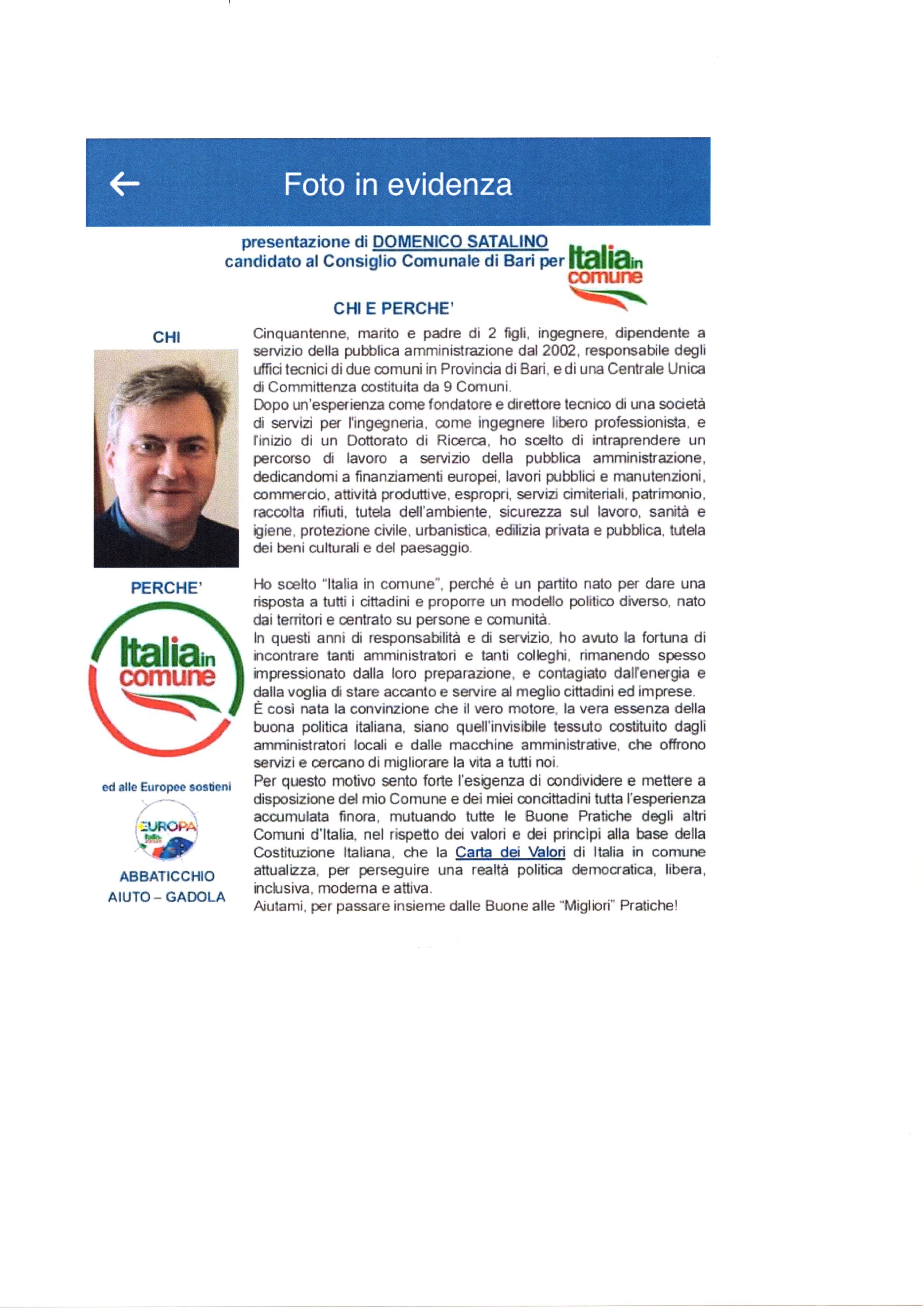 Dall’inchiesta giornalistica condotta dalla redazione di LeggiNoci risulterebbe che l’Ing. Domenico Satalino facesse politica con tanto di amicizie di gruppi e movimenti politici tali da vederlo addirittura come candidato al Consiglio Comunale di Bari nella lista “Italia in Comune” nell’anno 2019 (si veda foto allegata della lista dei candidati).