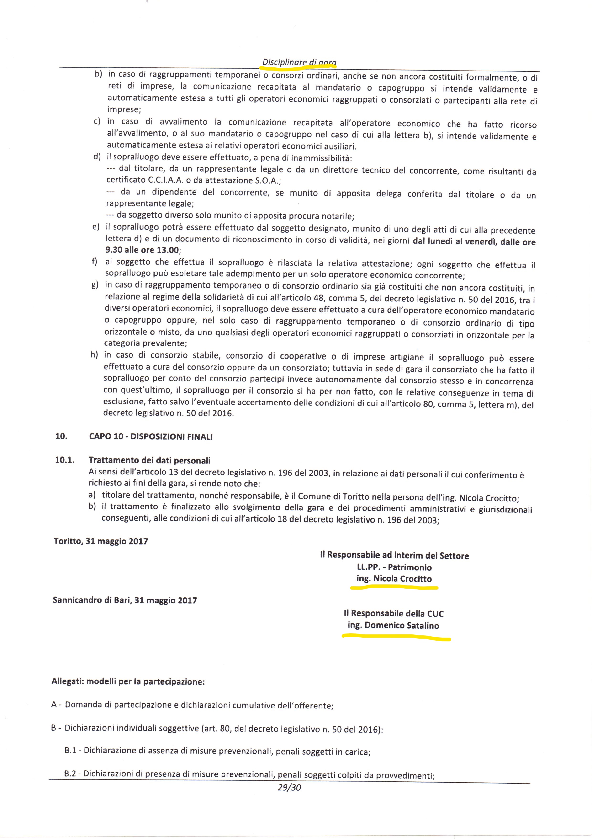 “L’affare di famiglia” saltò in quanto lo studio tecnico D’Ambrosio dello zio e dei cugini del Satalino in raggruppamento con tale ing. Nicola Di Pierno, professionista quest’ultimo di numerosissimi affidamenti nel foggiano già escluso e denunciato per false dichiarazioni in altre gare d’appalto di progettazione di opere sul dissesto idrogeologico, perdeva la gara d’appalto di Grumo Appula risultando poi, casualmente, vincitore (l’ing. Nicola Di Pierno in raggruppamento) nella Gara d’appalto Lama est di Toritto il cui bando di gara era, casualmente, a firma dell’Ing. D. Satalino e del Rup ing. Nicola Crocitto del Comune di Toritto. Casualmente, dopo l’esito della mancata aggiudicazione della gara di Grumo Appula allo zio, il Satalino dopo aver parlato con lo zio, con il cugino e con l’ing.Nicola Crocitto, come dallo stesso riferito ai magistrati, si reca a denunciare presunti fatti che sarebbero accaduti, a dire del Satalino, molto tempo prima della denuncia stessa.