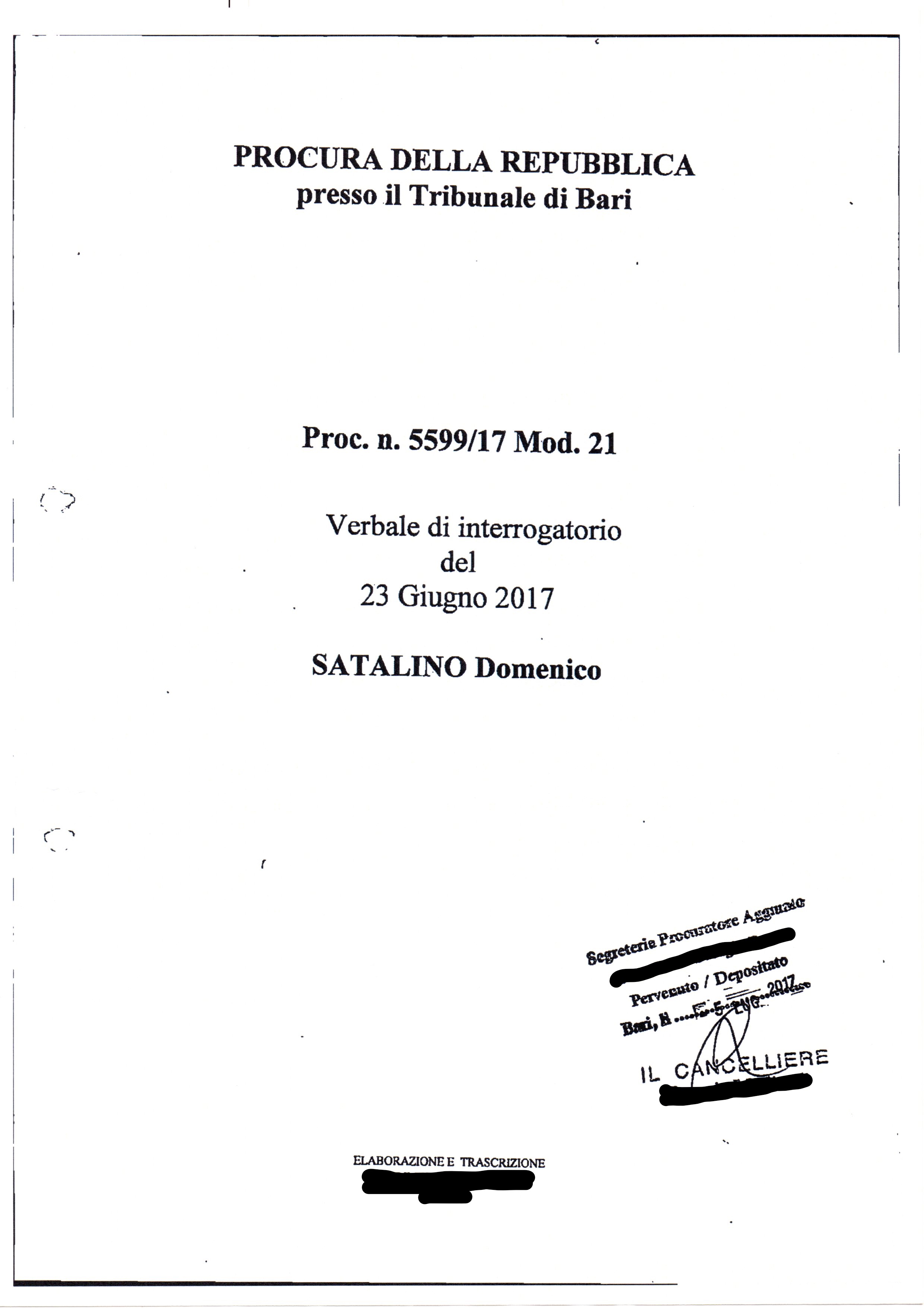Il denunciante ing. Domenico Satalino non apparirebbe, a leggere le carte, coerente con quanto denunciato e quanto emergerebbe dalle indagini condotte. A seguito della denuncia presentata presso la locale stazione dei Carabinieri, il Satalino veniva successivamente interrogato dai Pubblici Ministeri istruttori. Nel “Verbale di Interrogatorio del 23 Giugno 2017” di cui si pubblicano stralci (vedasi foto allegata), il Satalino veniva sottoposto ad alcune domande: