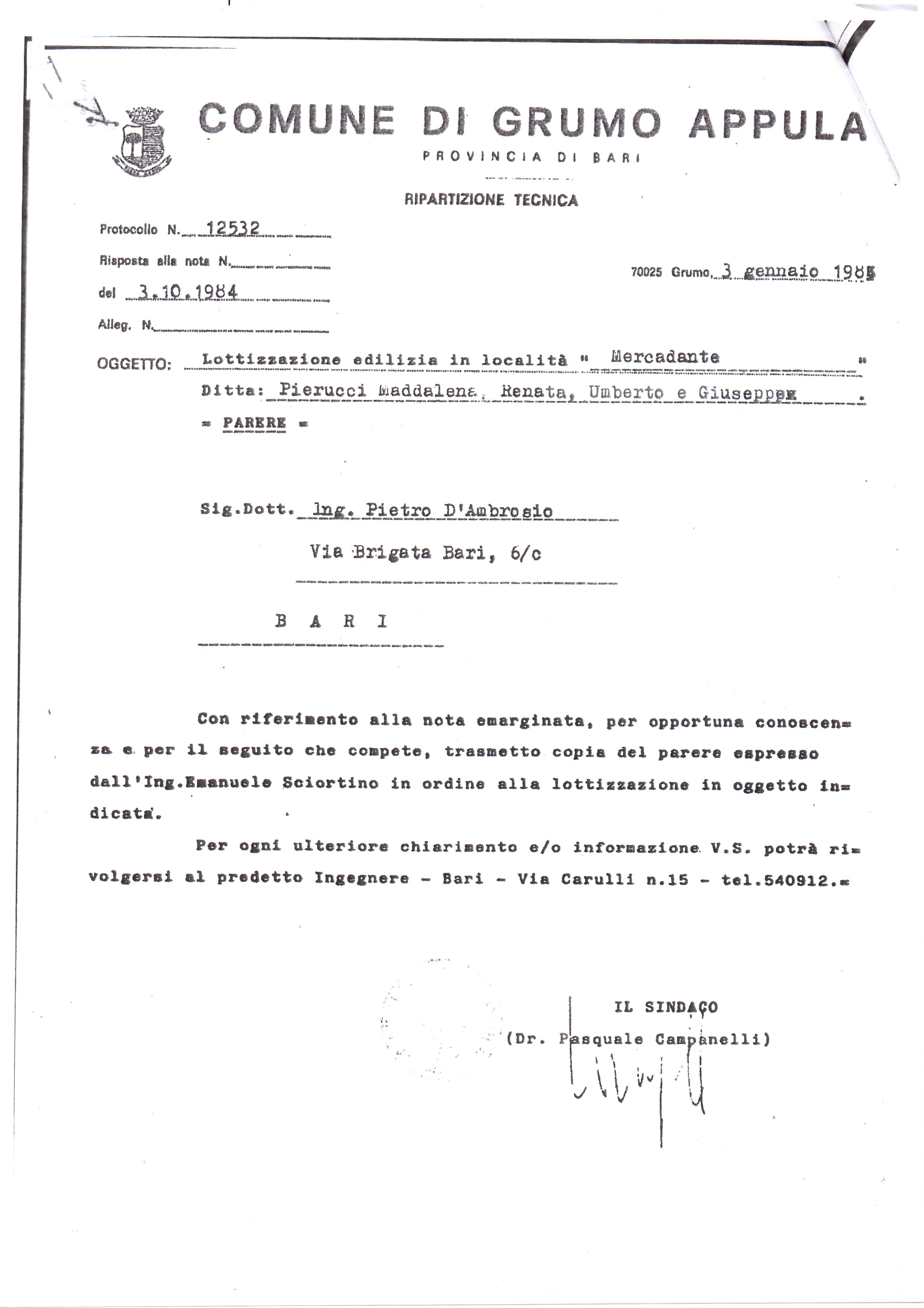 Dalle carte emergerebbe anche che proprio lo studio tecnico dello zio ing. Pietro D’Ambrosio e dei cugini dell’ing. Satalino, era il progettista della Lottizzazione Edilizia (si allega foto) dell’ area in località “Mercadante” nel Comune di Grumo Appula ossia del quartiere residenziale proprio ove doveva progettarsi l’opera di mitigazione idraulica di cui alla gara d’appalto di Grumo Appula e la cui progettazione dell’opera idraulica avrebbe potuto favorire la stessa progettazione della Lottizzazione dello zio, obiettivo questo portato avanti dallo studio tecnico dello zio del Satalino sin dal lontano 1984.