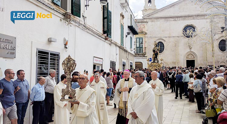La domenica mattina, invece, si è svolta come da tradizione, la consegna delle chiavi al Santo da parte del primo cittadino, prima della processione di gala lungo le vie del centro storico. Sia la celebrazione delle ore 10.00, sia la processione, è stata presieduta da S.E. Mons. Giuseppe Favale, vescovo della diocesi di Conversano-Monopoli. «San Rocco è passato lungo le strade del centro storico della nostra città. Idealmente è passato lungo le strade di tutta la città per fermarsi nella casa di tutte le famiglie nocesi. Accogliamo questa presenza del grande testimone del Vangelo di Cristo e lasciamoci ispirare dal suo amore per Dio e per i fratelli, nell’impegno di ogni giorno. È questo l’augurio che io rivolgo a tutti voi» ha commentato il vescovo a conclusione della processione mattutina.